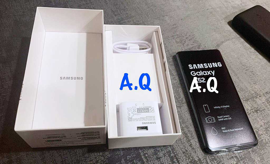 One of the shared photos show that the Samsung Galaxy A52 is IP67 water- and dust-resistant. It also reveals an in-box charger and a USB Type-A to Type-C cable inside the retail box.