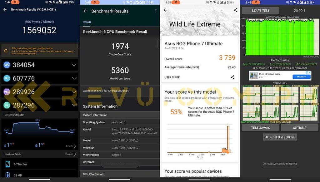 As expected, the biggest highlight of this top-of-the-line model is the performance. And ASUS doesn’t disappoint. The ROG Phone 7 Ultimate is easily the fastest Android phone we’ve reviewed so far, and the benchmarks agree. Even without the cooler, our unit scored over 1,500,000 points in the Antutu 10 public beta. We already know that the latest Qualcomm Snapdragon 8 Gen 2 chipset is a performance monster, but pairing it with the ROG Phone 7 Ultimate’s best-in-class cooling system apparently unlocks its full potential.