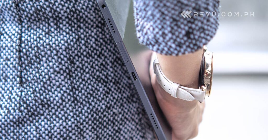 The built-in quad speakers are loud, and it’s possible to listen to better-quality audio files with a high sampling rate since the tablet supports Hi-Res audio playback. There’s a pair of speakers on the left side and another two on the right. They’re easy to cover while handheld, but their placement is perfect when the tablet is propped on a stand using the folio cover case that came with our unit. For those who swear by wired headphones, the product also comes with a standard 3.5mm jack.