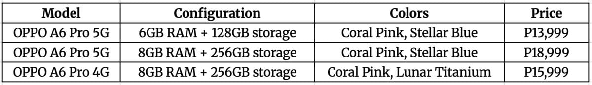 Priced from P13,999 (roughly $238), the OPPO A6 Pro is available for preorder nationwide until November 14, 2025.